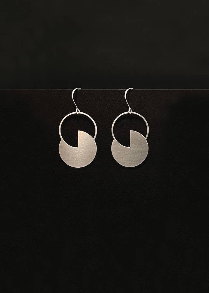 Inspired by the beauty of simple geometry, these elegant drop earrings feature two interlocking circles, evoking the graceful curves of an eclipse.